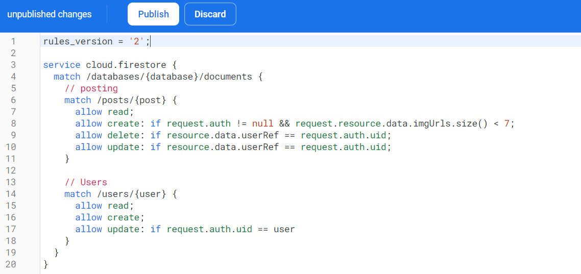 For example, if you want only logged-in users to update and delete a post, we can set the rule as follows