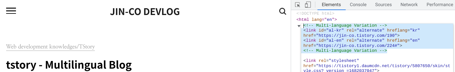 티스토리에서 만든 다국어 블로그를 가지고 해당 기능을 구현해 보겠습니다. 관리자 화면에서 '블로그 관리' -> '스킨편집' -> 'HTML 편집' -> 'HTML' 순으로 이동하여 아래처럼 'alternate' 링크 태그를 삽입합니다.