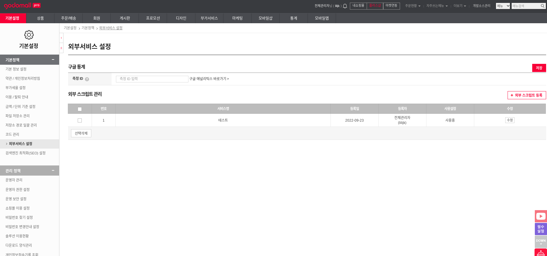 관리자 접속 후 상단메뉴에 '기본설정' -> 좌측에 열린 메뉴에서 '외부서비스 설정' 선택