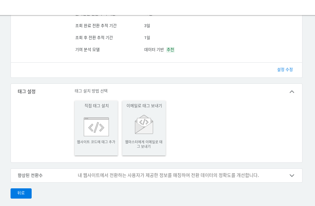'태그 설정' 박스를 열고 첫 번째 메뉴를 선택합니다 (자동전환의 경우 태그관리자 선택지는 없음).