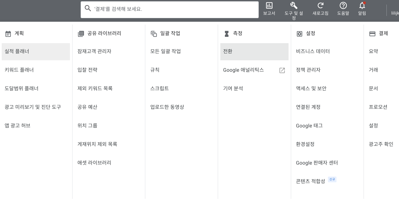 먼저, 광고 중인 계정에서 상단 메뉴 '도구 및 설정' -> 측정항목에서 '전환'을 선택합니다.