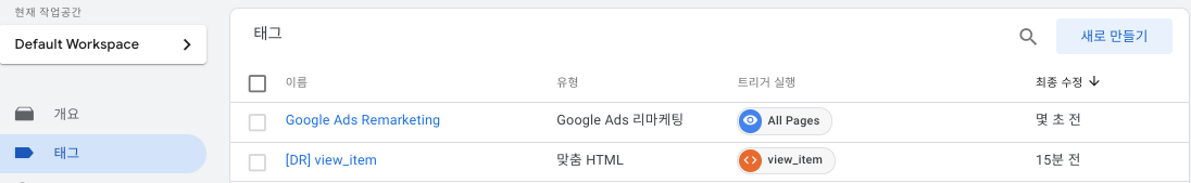 관리자 로그인 (*사이트와 연결된 태그 관리자) 후 '태그' 선택 -> '새로 만들기'