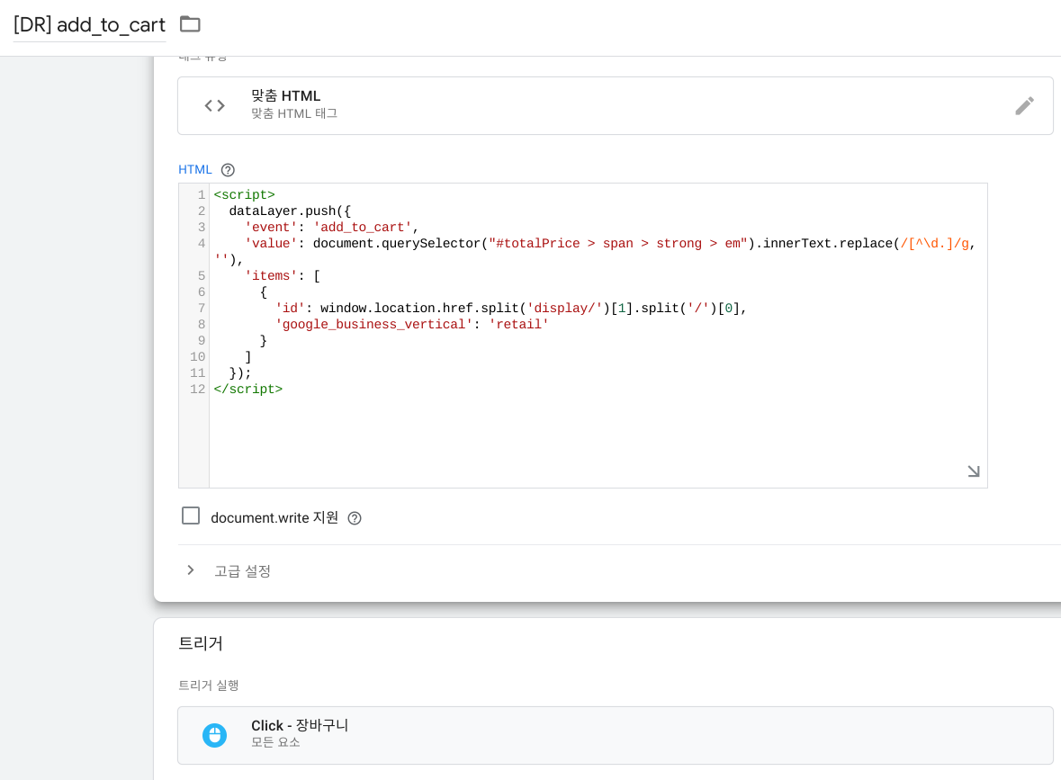태그 관리자에서 태그 새로 만들기를 누르고 '맞춤 HTML'을 선택한 뒤 아래 코드를 실제 값과 함께 넣습니다. 이때 트리거는 해당 이벤트에 맞게 설정합니다.