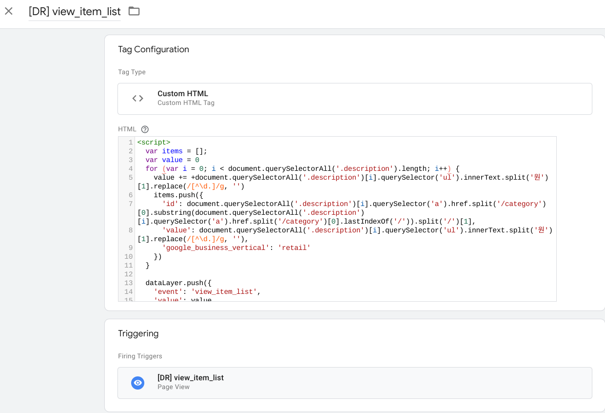 각 이벤트 별 데이터레이어가 완성되면 이제 이를 활용만 하면 되는데요. 데이터레이어 추가된 이벤트는 해당 이름을 가진 이벤트를 발생시킵니다. 해당 이벤트는 데이터레이어에 정보를 추가할 때 발생하므로 이를 활용하면 됩니다. *주의할 점은 이벤트를 생성하는 코드에 오류가 있는 경우 이벤트 자체가 발생하지 않으므로 없는 요소를 값으로 쓰는 건 아닌지 등 확인이 필요합니다.