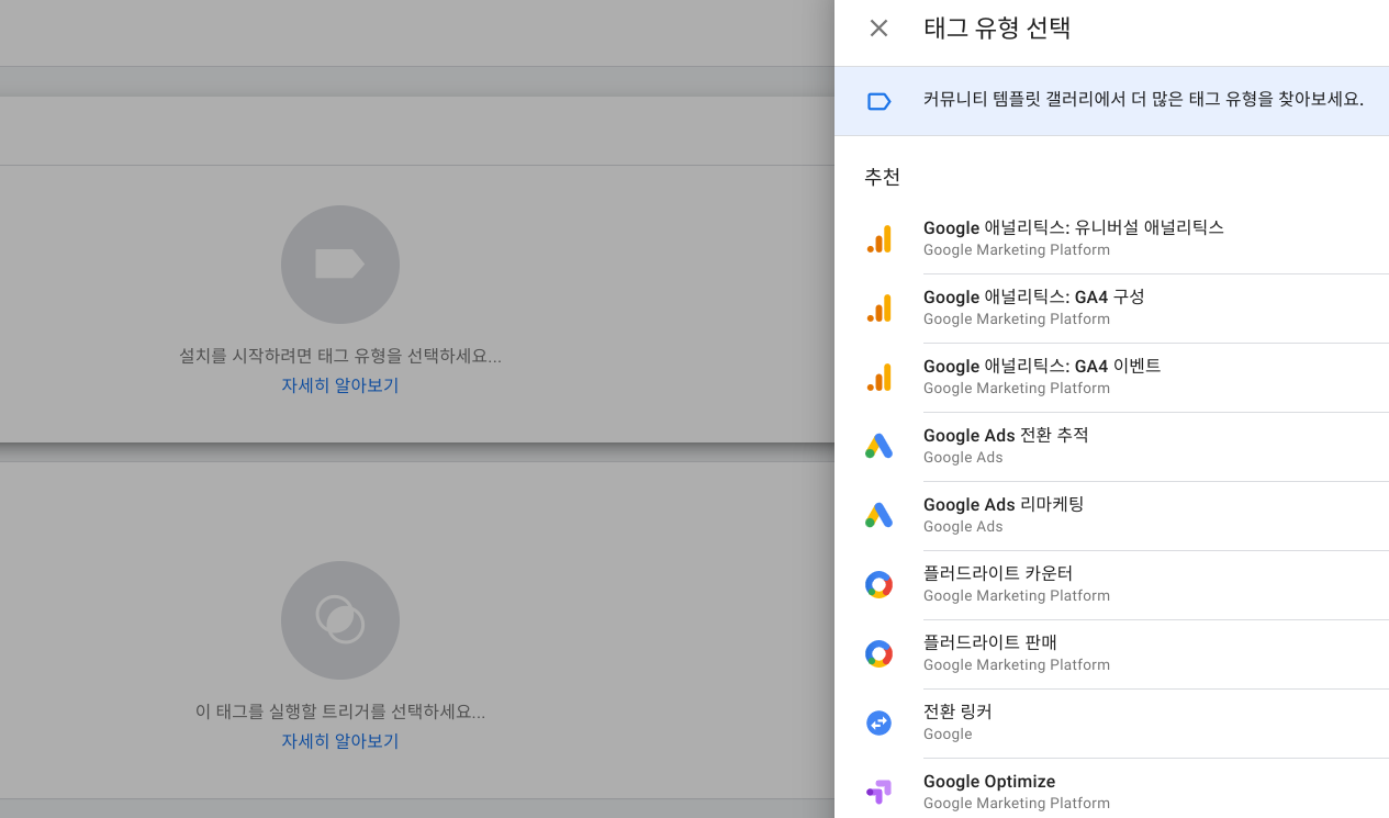 열린 화면 하단에 '태그 설정' 선택 후 '직접 설치' 또는 '태그 관리자 사용' 선택