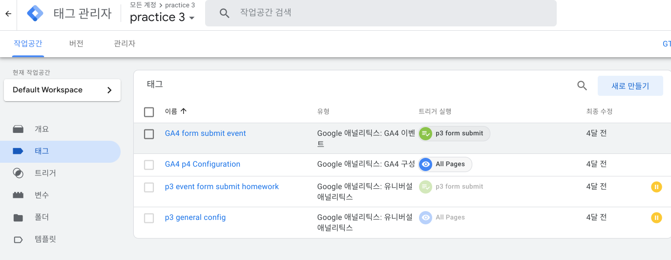 관리자 로그인 (*사이트와 연결된 태그 관리자) 후 '태그' 선택 -> '새로 만들기'