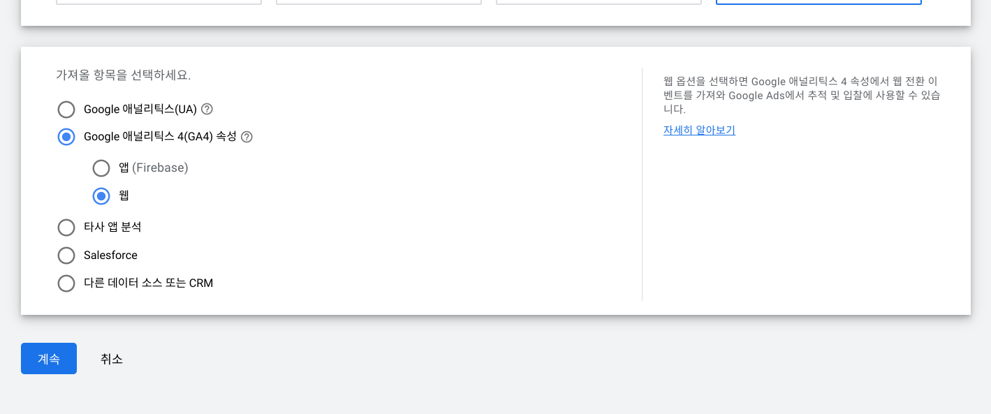 GA4 선택, 아래와 같이 앱과 웹으로 나뉘는 데 사용하는 플랫폼에 맞게 선택합니다. 이후 '계속'을 누릅니다.