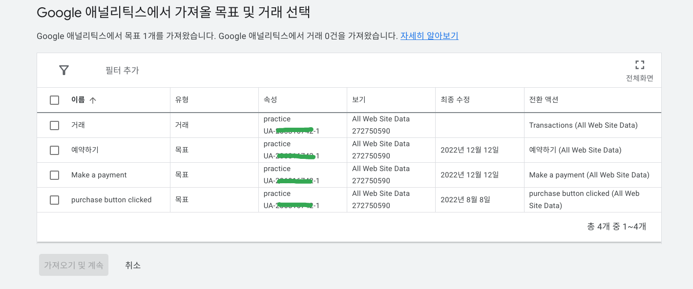 가져올 전환을 선택하고 '가져오기 및 계속'을 누릅니다.