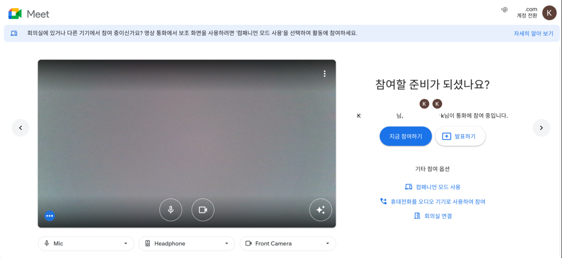 참여준비 (마이크, 카메라를 사용하지 않을 경우 해당 아이콘들을 클릭하면 꺼집니다) 후 우측에 '지금 참여하기' 클릭