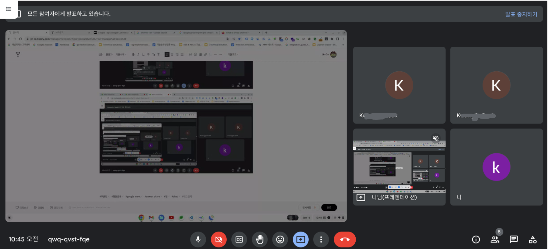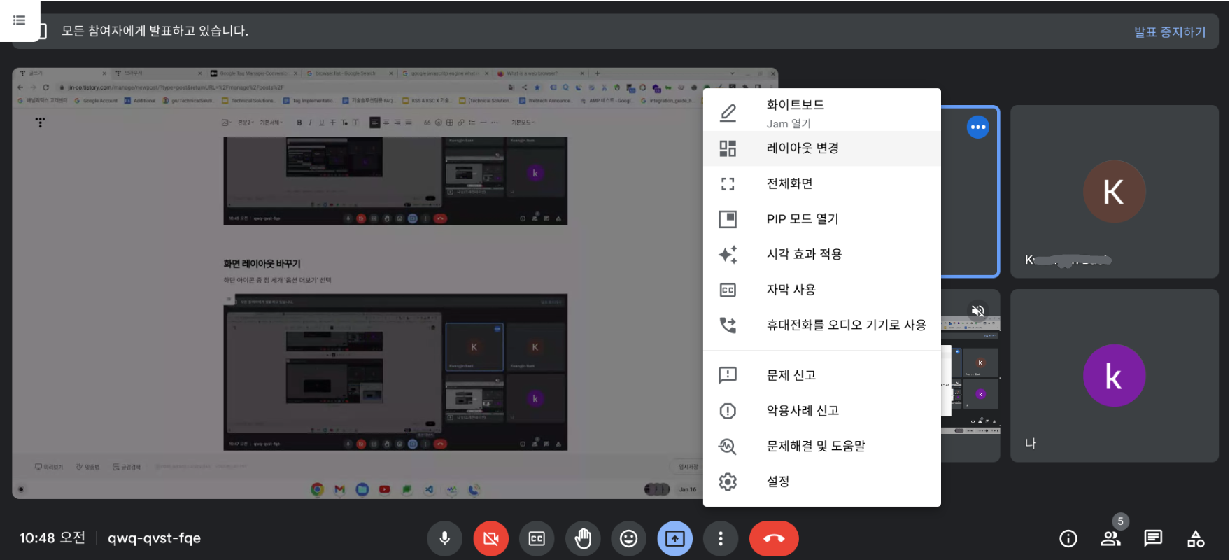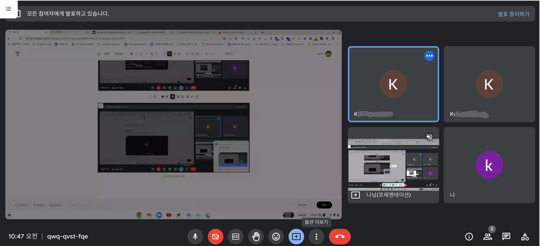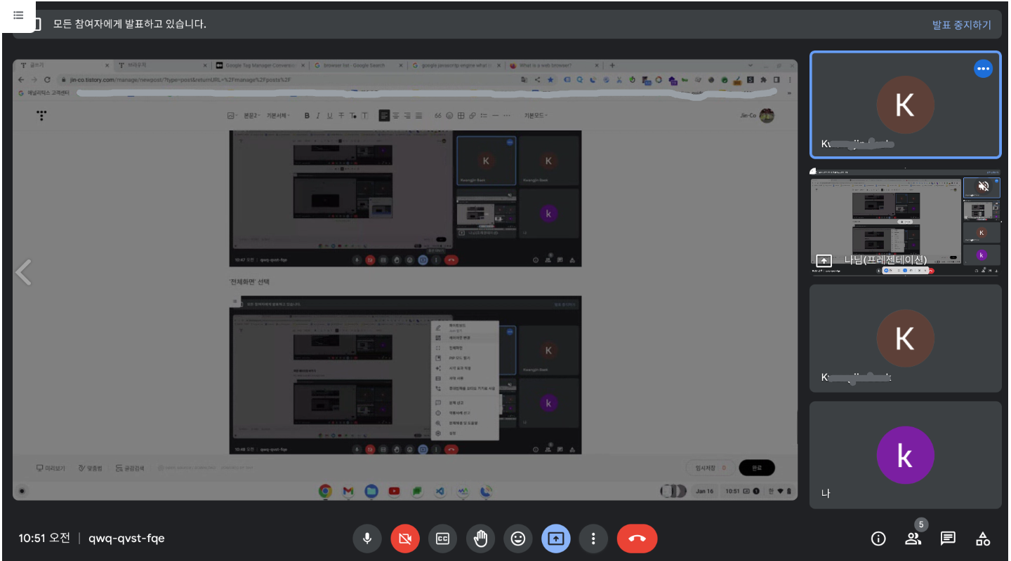 ※ 창이나 탭은 해당 창 또는 탭만 표시하기 때문에 공유 중 다른 창 또는 탭을 공유해야 하는 경우 새로 공유를 해야 함.