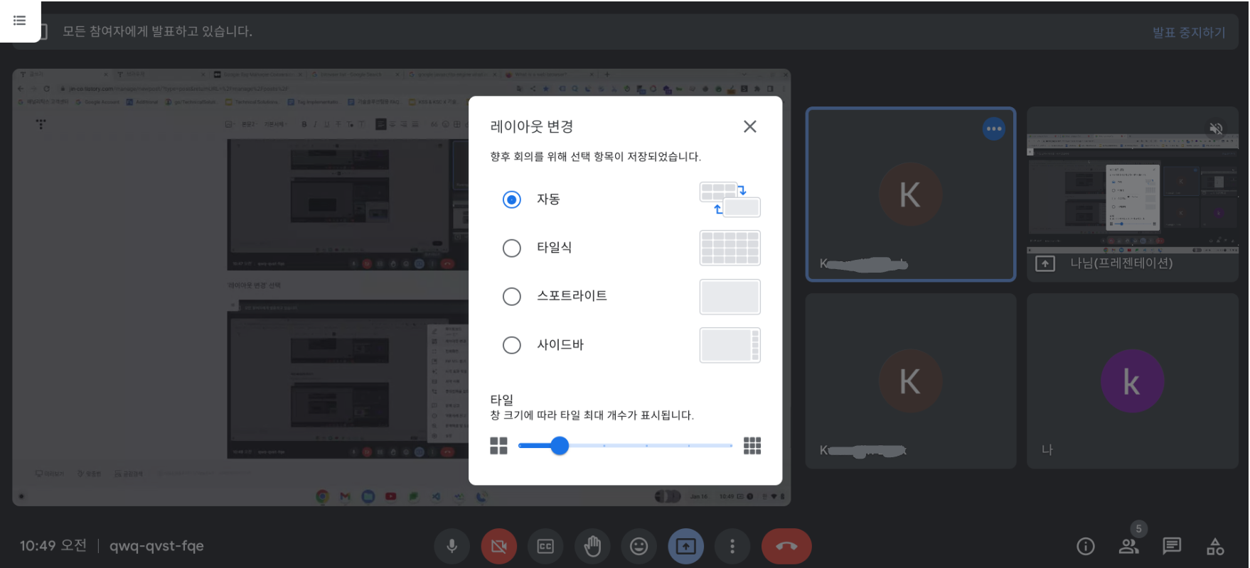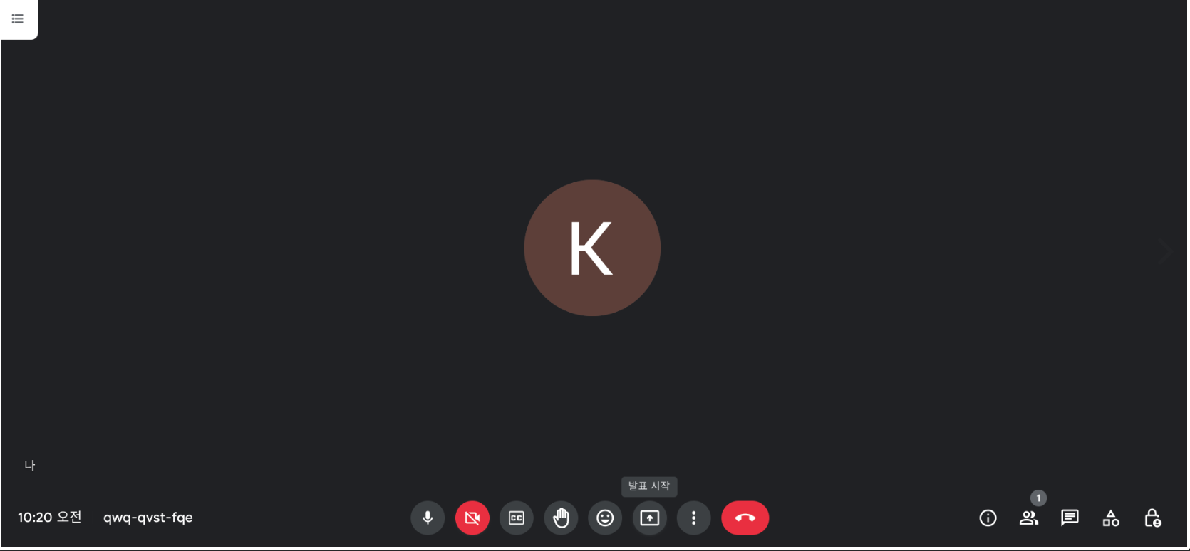 화면 아래 아이콘 중 네모박스 안에 화살표 위로된 거 선택 (발표시작)