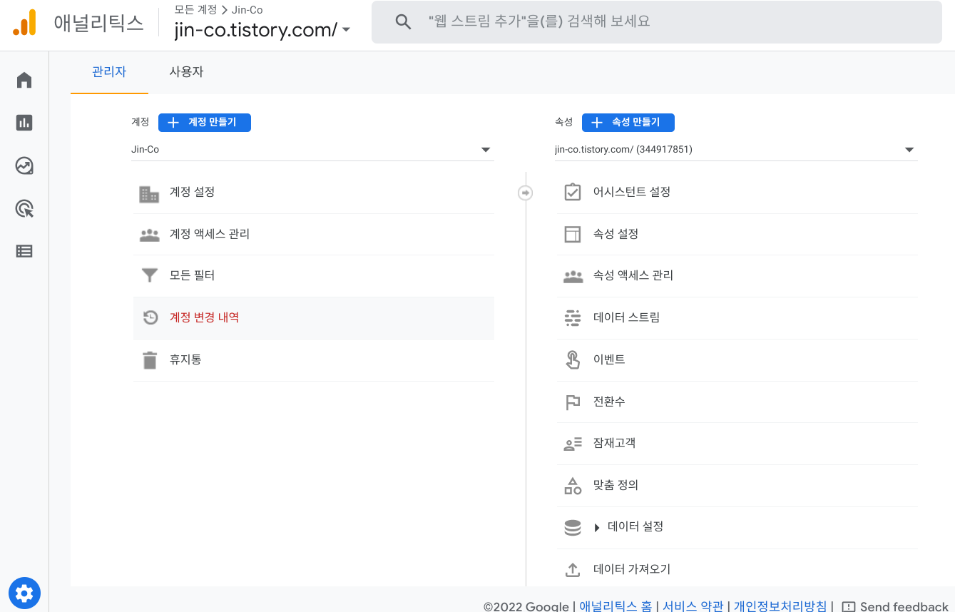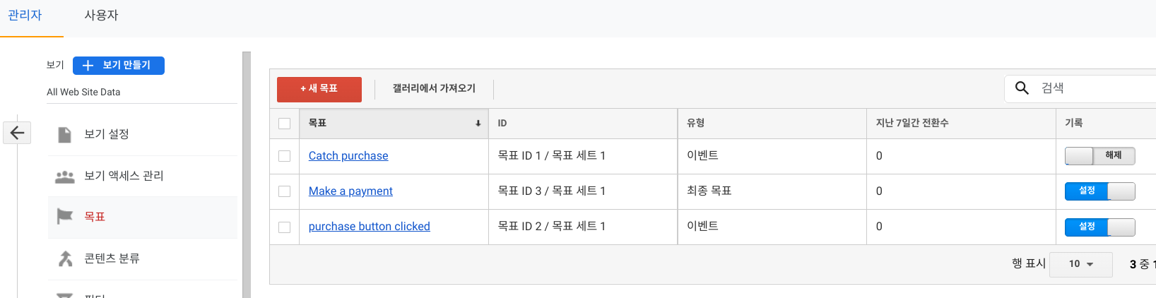 UA에서는 목표라는 이름으로 설정하는데요. 좌측 메뉴 하단에 '관리' 선택 후 열린 화면에서 세 번째 열에 '목표' 선택