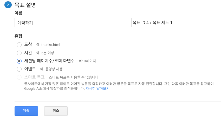 이 유형은 사용자가 한 세션 안에 본 페이지 (화면수)를 기준으로 발동합니다. 해당 유형 선택 후 '계속'