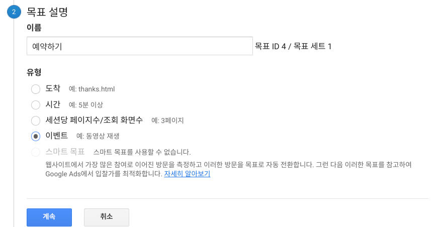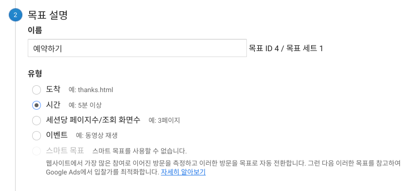 시간은 사용자가 사이트에 머무른 시간을 기준으로 발동하는데요. '시간'을 선택하고 '계속'을 누릅니다.