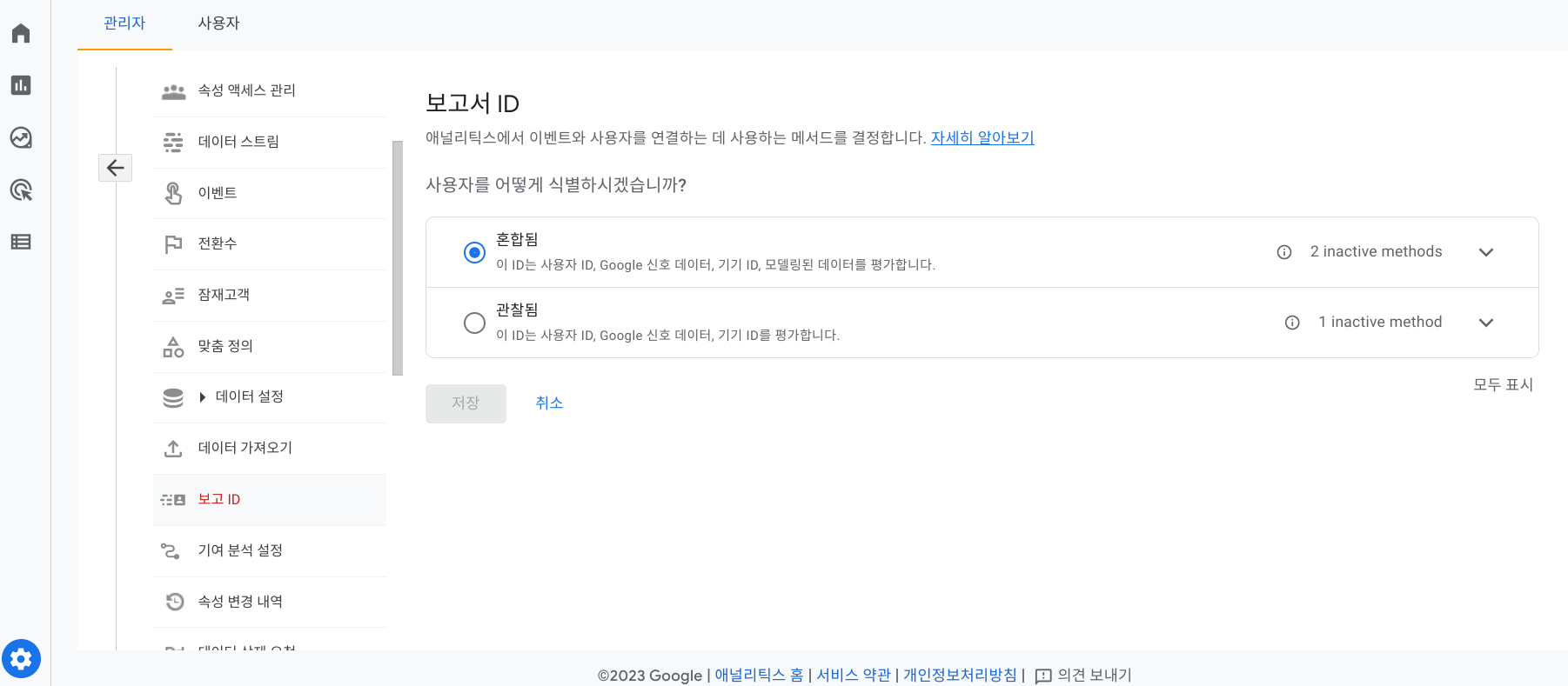 해결은 식별아이디 옵션변경을 통해 가능한데요. 애널리틱스 계정에 로그인한 뒤 '관리' -> '보고 ID'를 선택하고 열린 화면에서 '모두표시'를 누르고