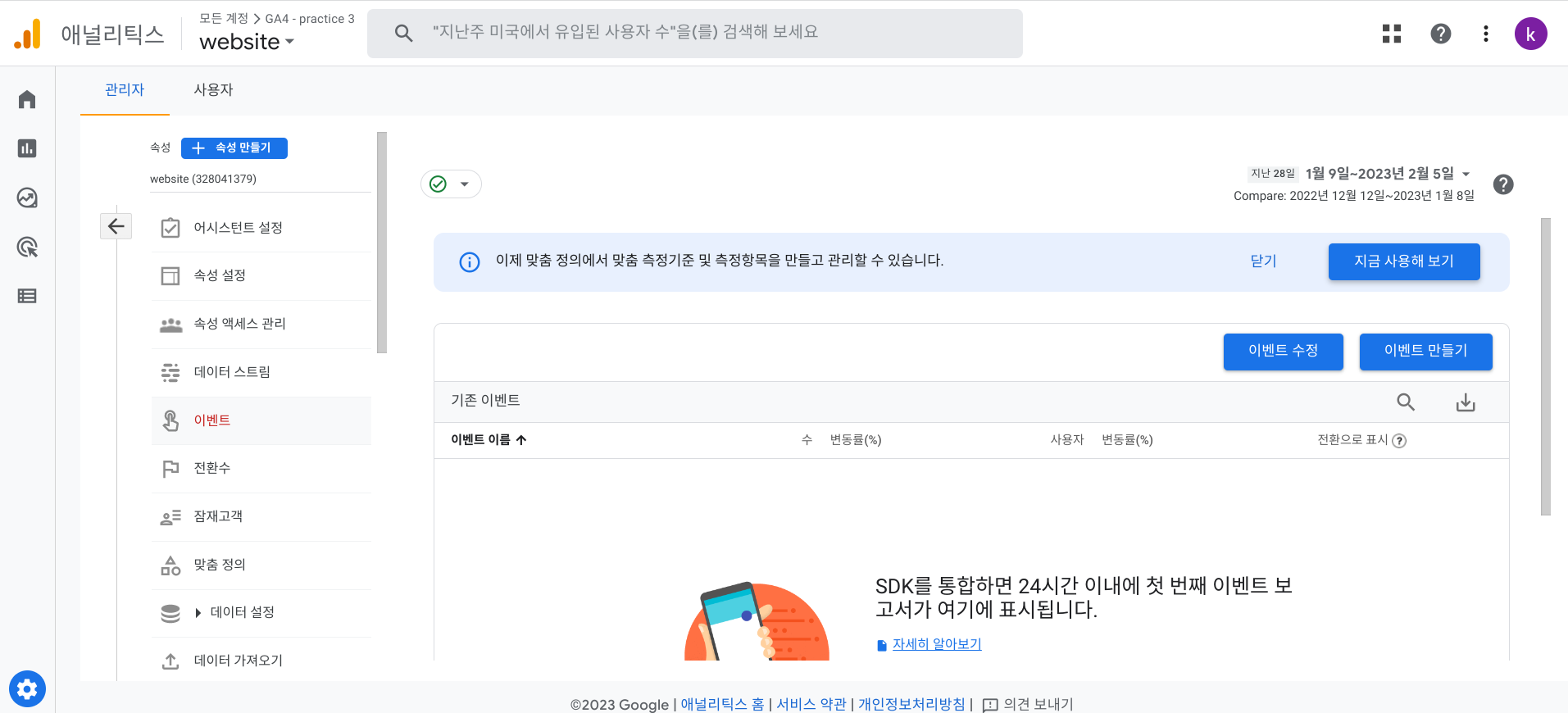 애널리틱스 GA4 로그인 -> '관리' -> 속성아래 '이벤트' -> '이벤트 만들기'