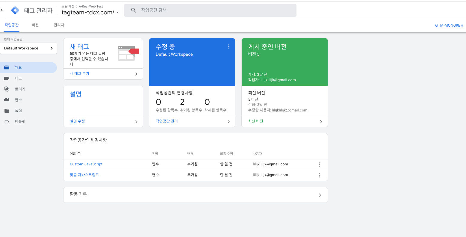 태그관리자에서 해당 컨테이너를 열고 아래와 같은 화면에서 우측에 'GTM-'으로 시작하는 아이디를 누릅니다.