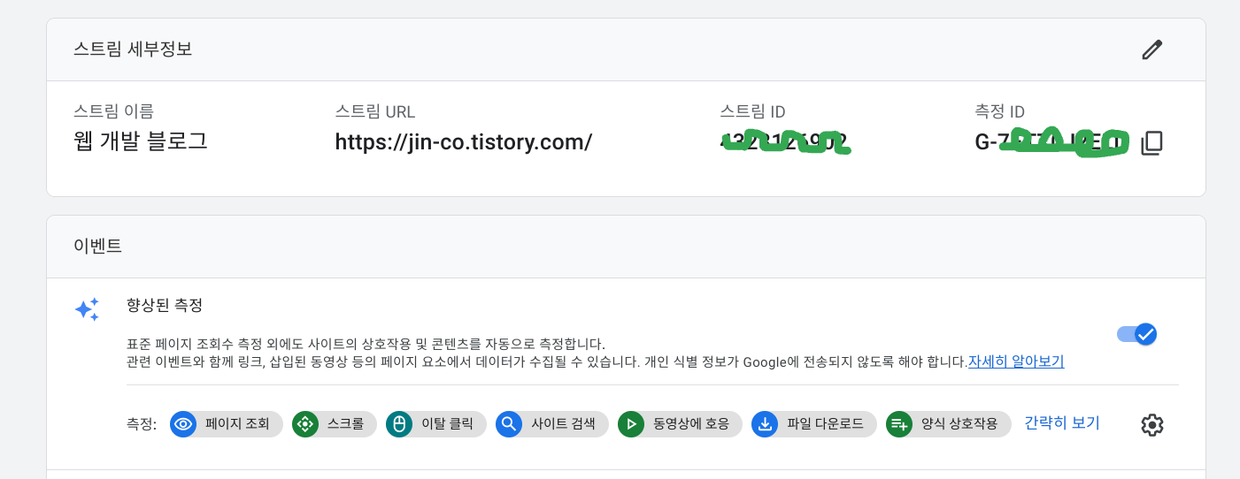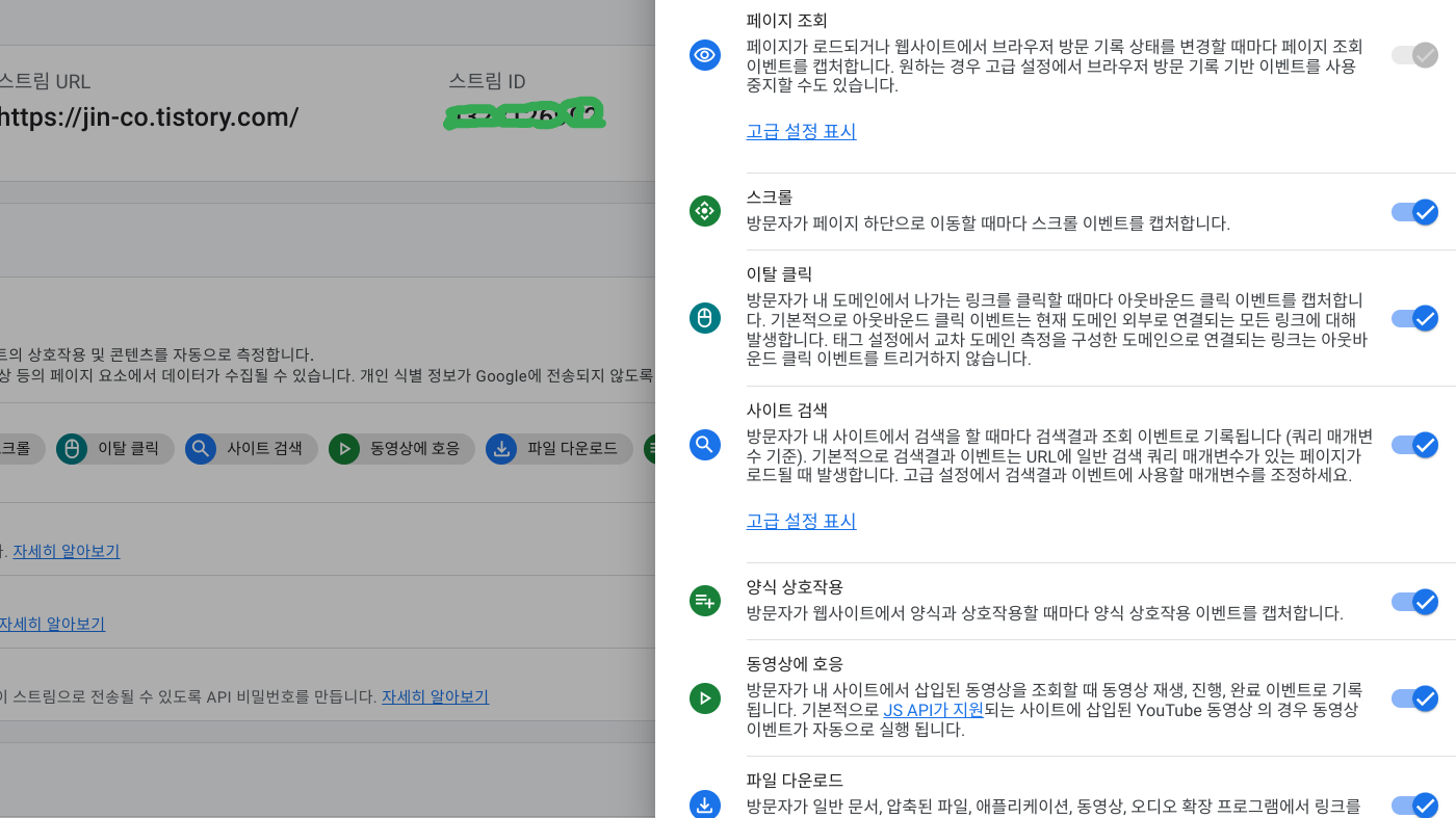 자동이벤트와 마찬가지로 속성 생성과 함께 자동으로 생성됩니다. UA와 달리 추가설정 없이 사용가능한 이벤트들로 사용을 원치 않는 경우 '관리' -> 속성 항목에서 '데이터 스트림'에 들어가 각 이벤트의 사용여부를 선택하거나