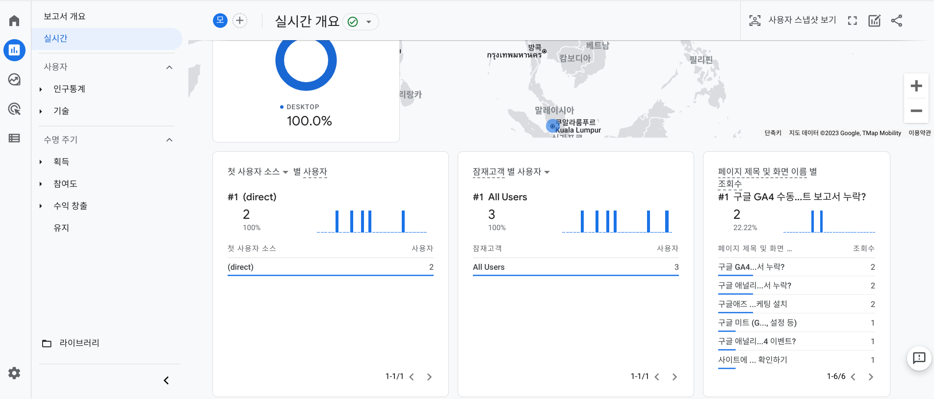 1. 보고서 개요 '보고서' -> '보고서 개요' 메뉴에서 확인 가능한 보고서로 다양한 정보확인가능 2. 실시간 '보고서' -> '실시간' 메뉴에서 확인 가능한 보고서로 거의 실시간으로 다양한 정보확인