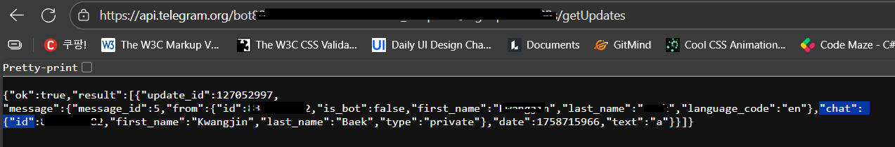 /start를 입력하고 검색한 창을 새로고침하면 면 내chat_id값을 확인할 수 있습니다. - 이