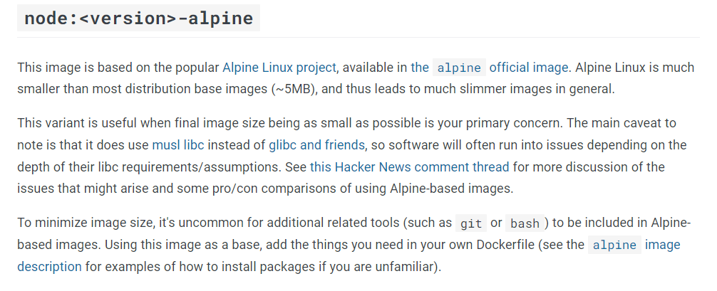 보이는 것처럼 노드제이에스의 경우 node:<version> 형식으로 구성됩니다.