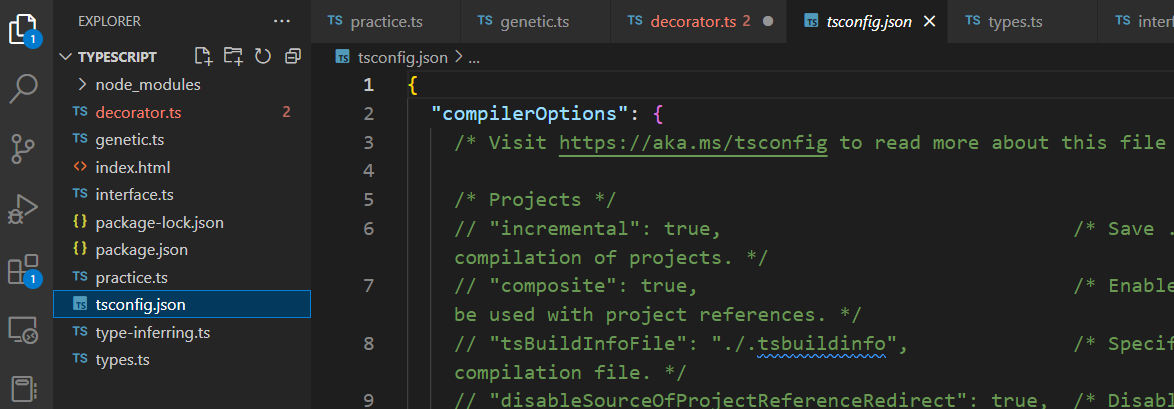 실행이 완료되면 아래와 같이 'tsconfig.json'파일이 생성됩니다. 설정된 옵션이 많은데 데코레이션 사용과 무관하므로 모두 삭제하고