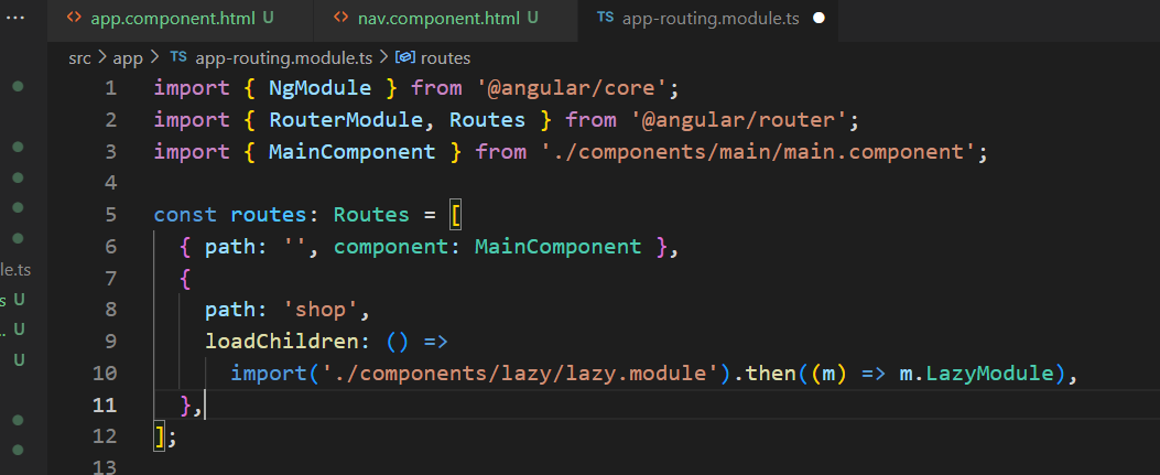 마지막으로 레이지 모듈에 설정된 레이지라우팅 모듈을 아래처럼 추가합니다. 이때, 레이지 로딩하는 컴포넌트 모듈을 내보내기에서 삭제하여야 경로를 통해서만 작동하게 됩니다.