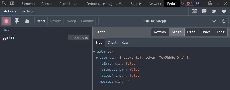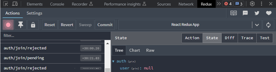 연결이 되면 아래와 같이 개발자 도구의 리덕스 익스텐션을 통해 상태확인 가능