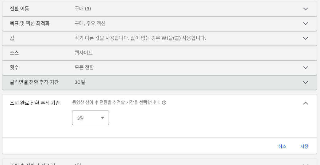 사용자가 광고 조회한 뒤 어느 정도 기간 안에 해당 전환을 발생시켰을 때 이를 광고를 통한 전환으로 인정할 것인지를 설정하는 항목입니다. 예를 들어, 1일로 지정 시 광고 클릭 후 1일 초과하여 해당 전환을 일으켰을 경우 전환으로 인정하지 않습니다.