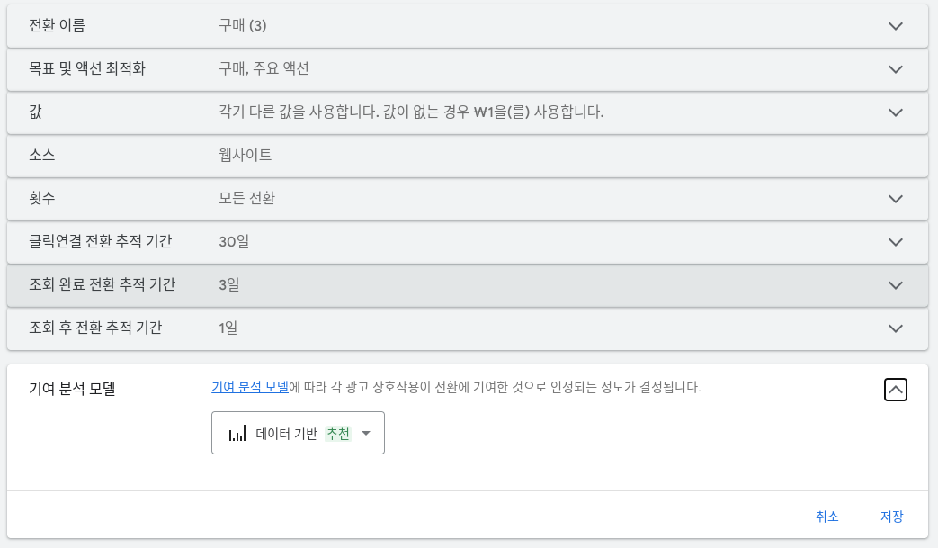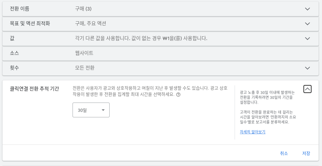 사용자가 광고 클릭하고 어느 정도 기간 안에 해당 전환을 발생시켰을 때 이를 광고를 통한 전환으로 인정할 것인지를 설정하는 항목입니다. 예를 들어, 30일로 지정 시 광고 클릭 후 30일 초과하여 해당 전환을 일으켰을 경우 전환으로 인정하지 않습니다.