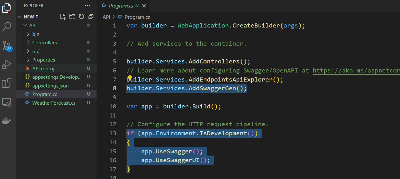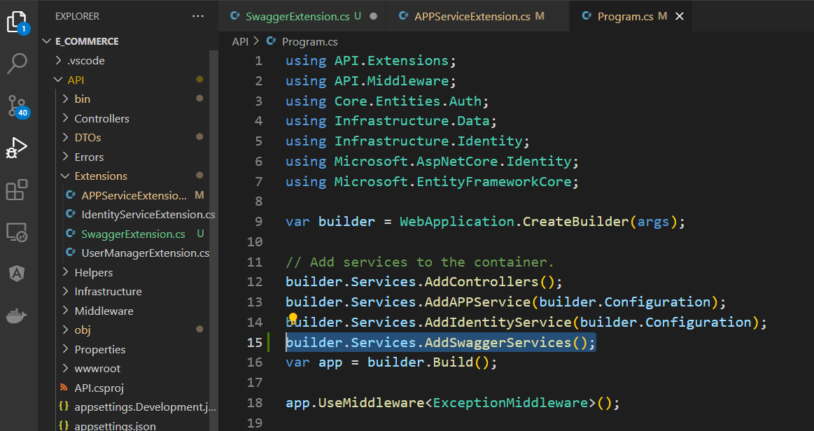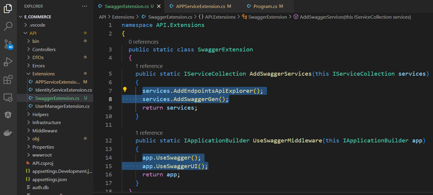 스웨거 관련된 서비스 및 미들웨어를 Program.cs 파일에 분리하는 방법을 보겠습니다.