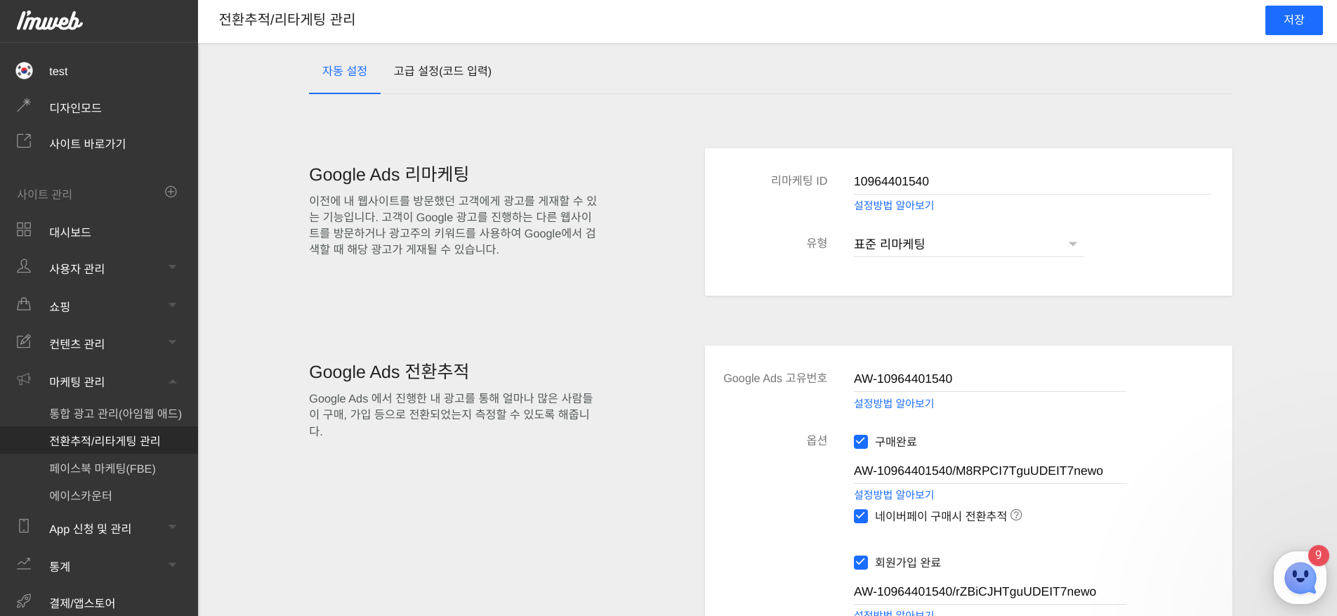 아임웹 관리자 로그인 -> 좌측메뉴에서 '마케팅 관리' -> '전환추적/리타게팅 관리' 선택