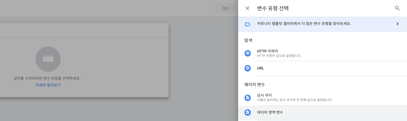 '변수' -> 사용자 정의 변수 '새로 만들기' -> '변수 구성' -> '데이터 영역 변수' 선택