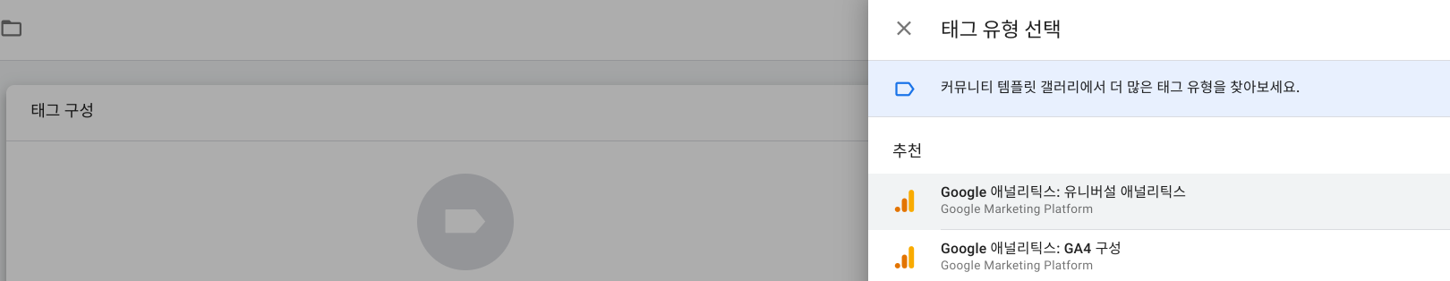 태그 -> 새로 만들기 -> 태그구성 박스선택 -> 'Google 애널리틱스'를 선택