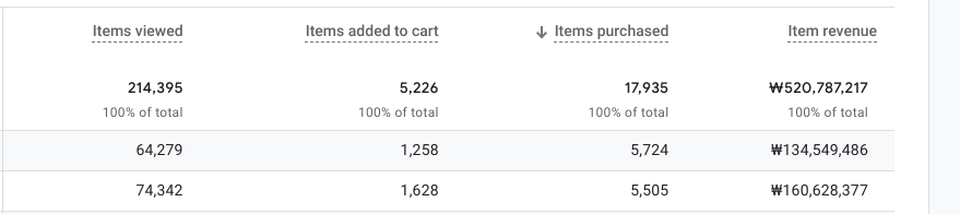 ★ 구매 items에 price는 필수는 아니지만 전자상거래 구매보고서의 'item revenue'의 경우 아이템 가격으로 활성화되므로 추가가 권장됩니다.