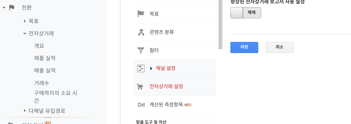 애널리틱스의 구 버전인 UA는 전자상거래를 사용하기 위해 먼저 설정이 필요합니다. 관리자로 로그인 후 좌측 하단 '관리' 메뉴 클릭 후 세 번째 열에서 '전자상거래 설정' 선택.