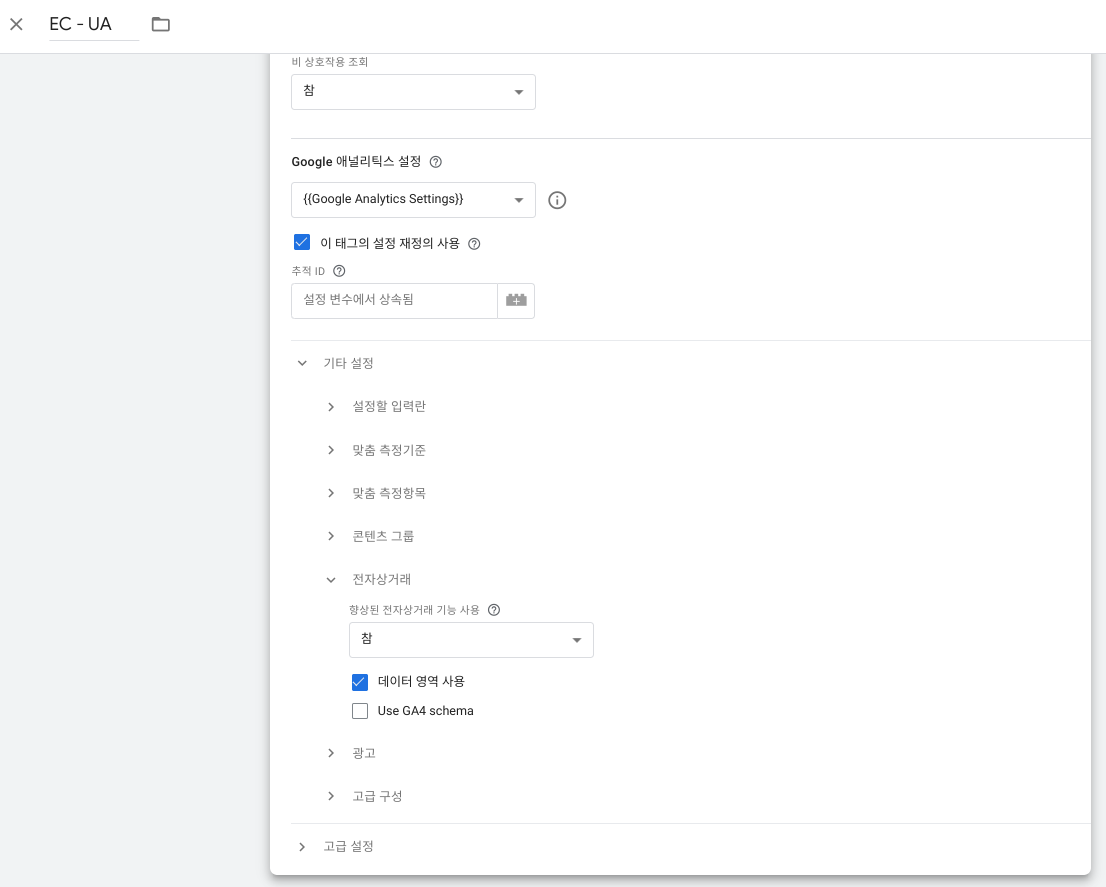 '기타 설정'을 열고 '전자상거래 데이터 전송' 박스를 체크합니다 (소스는 Data Layer설정 그대로 유지).