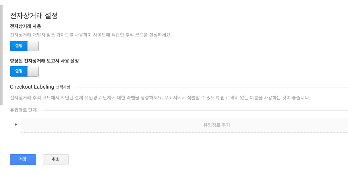 전자상거래 사용 설정을 켜줍니다. UA는 일반 전자상거래와 향상된 전자상거래로 나누어지며, 일반전자상거래는 구매완료만 집계하는 반면, 향상된 전자상거래는 쇼핑행동, 결제행동 등 조금 더 상세한 추적을 가능하게 해 줍니다. 향상된 전자상거래를 원하는 경우 두 번째 버튼까지 켜면 됩니다.