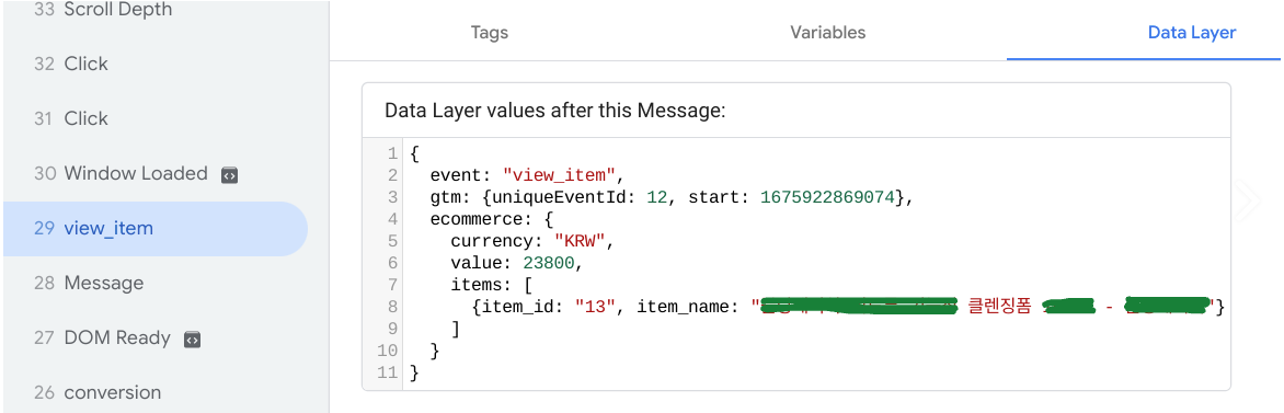 ※ 데이터레이어 정보를 참고하는 변수 이름 지정. 객체 하위에 값은 '.'으로 접근 가능합니다.