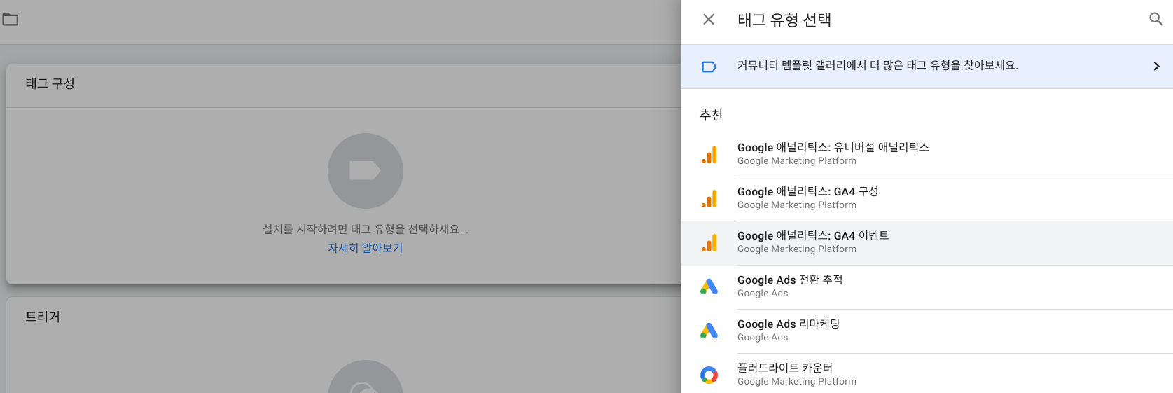 '태그' -> '새로 만들기' -> '태그 구성' -> 'Google 애널리틱스: GA4 이벤트' 선택