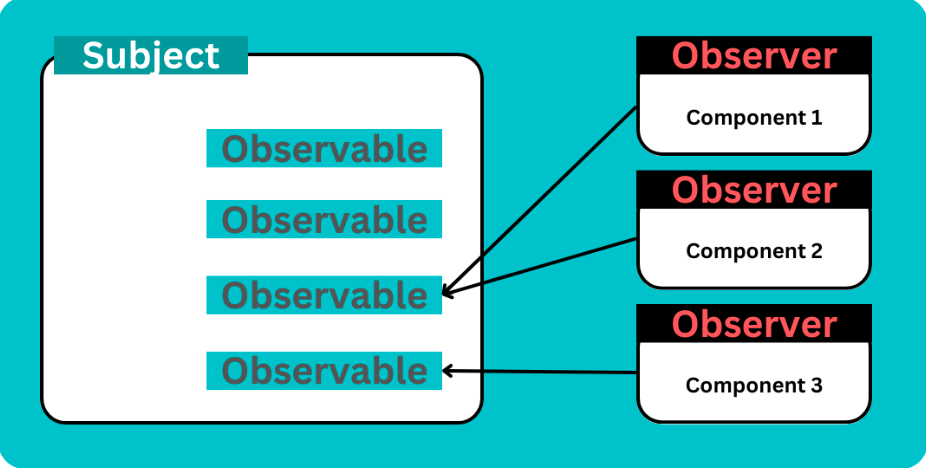 Subject라는 객체를 생성하고 관찰의 대상이 되는 Observable을 만듭니다. Observer들은 Subject에 생성된 Observable를 구독하는 존재로 (Subject은 신문사, Observable은 신문, 마지막으로 Observer들이 구독자라고 생각하면 쉽습니다). 해당 Observable의 상태가 변할 때마다 Subject로부터 알림을 받습니다.