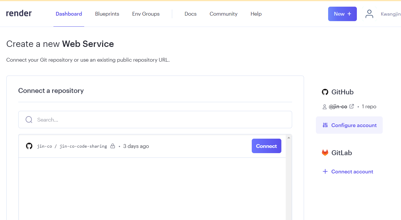 다시 렌더로 돌아오면 선택한 레포를 선택할 수 있는데요. 'Connect'를 누릅니다.