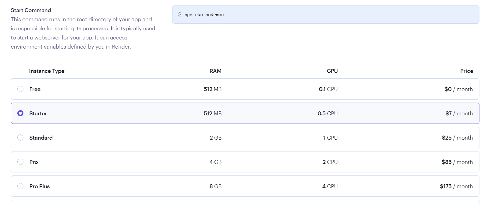 그리고 플랜을 선택하는데요. 저는 'Starter' 플랜을 선택했습니다 (한 가지 장점은 디플로이가 성공한 경우만 요금을 매깁니다).