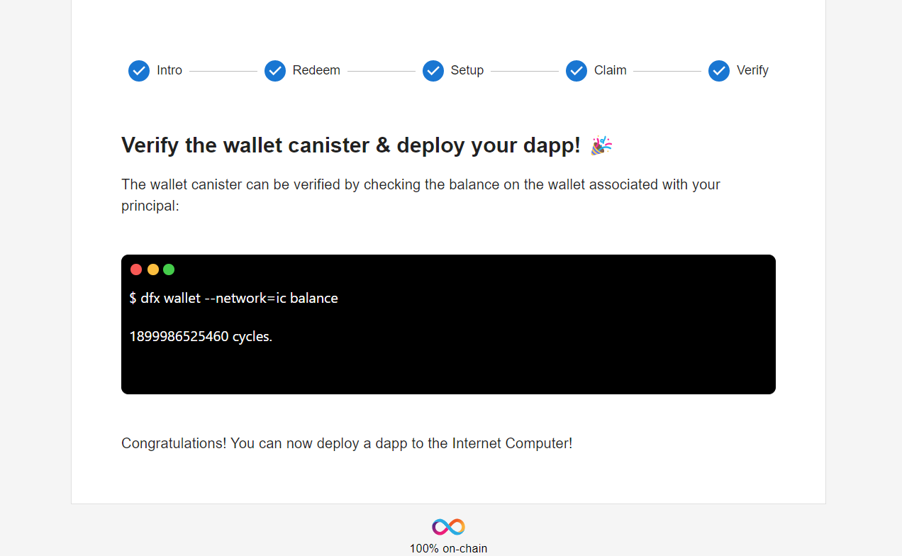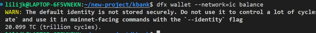프로젝트로 이동하여 커맨드라인에서 실행하면 지갑이 생성됩니다 (커맨드는 반드시 해당 캐니스터 안에서 실행해야 합니다).