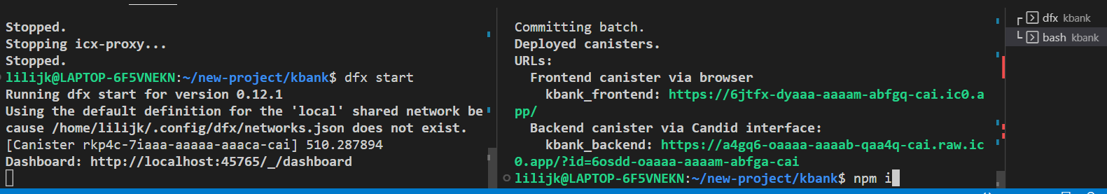 아래처럼 'Deployed canisters' 메시지가 뜨면 성공입니다. 배포 메시지 아래 링크를 열면 해당 웹 페이지를 열 수 있습니다.