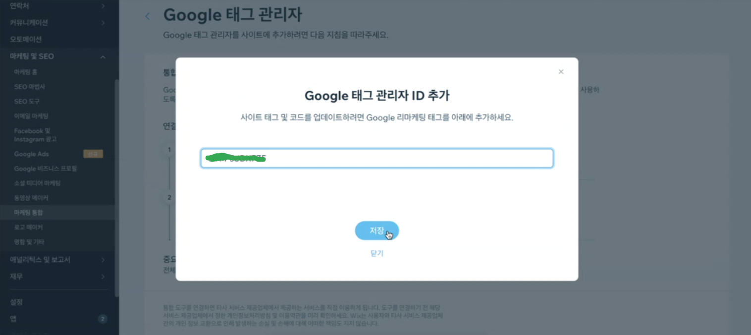 태그관리자에서 복사한 아이디를 입력하고 '저장' (아이디 앞 뒤로 공백이 있으면 안 됩니다 ㅎㅎ)