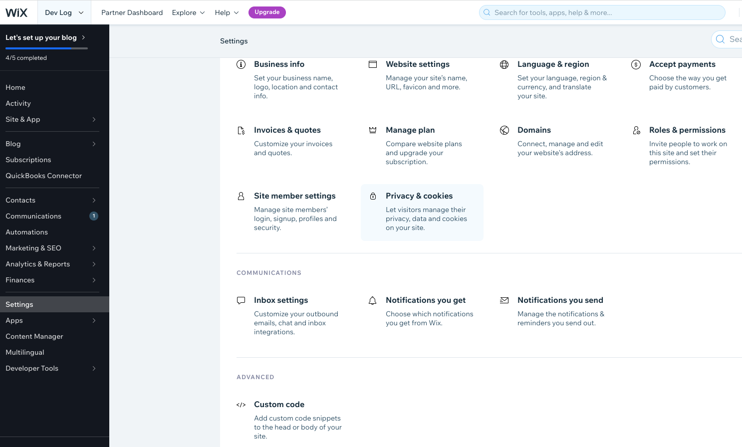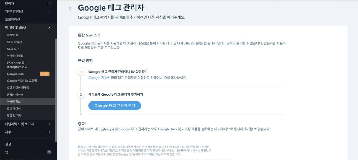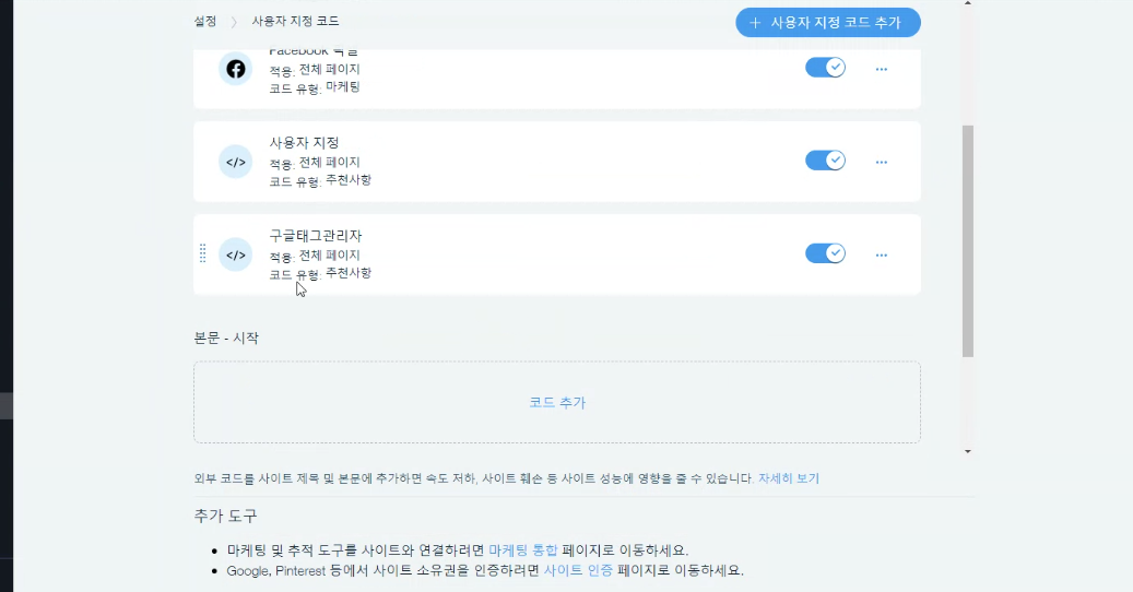 윅스는 외부 스크립트를 삽입하는 기능인 사용자 지정코드 추가와 마케팅 제품연결 도구인 마케팅 통합도구를 제공합니다.