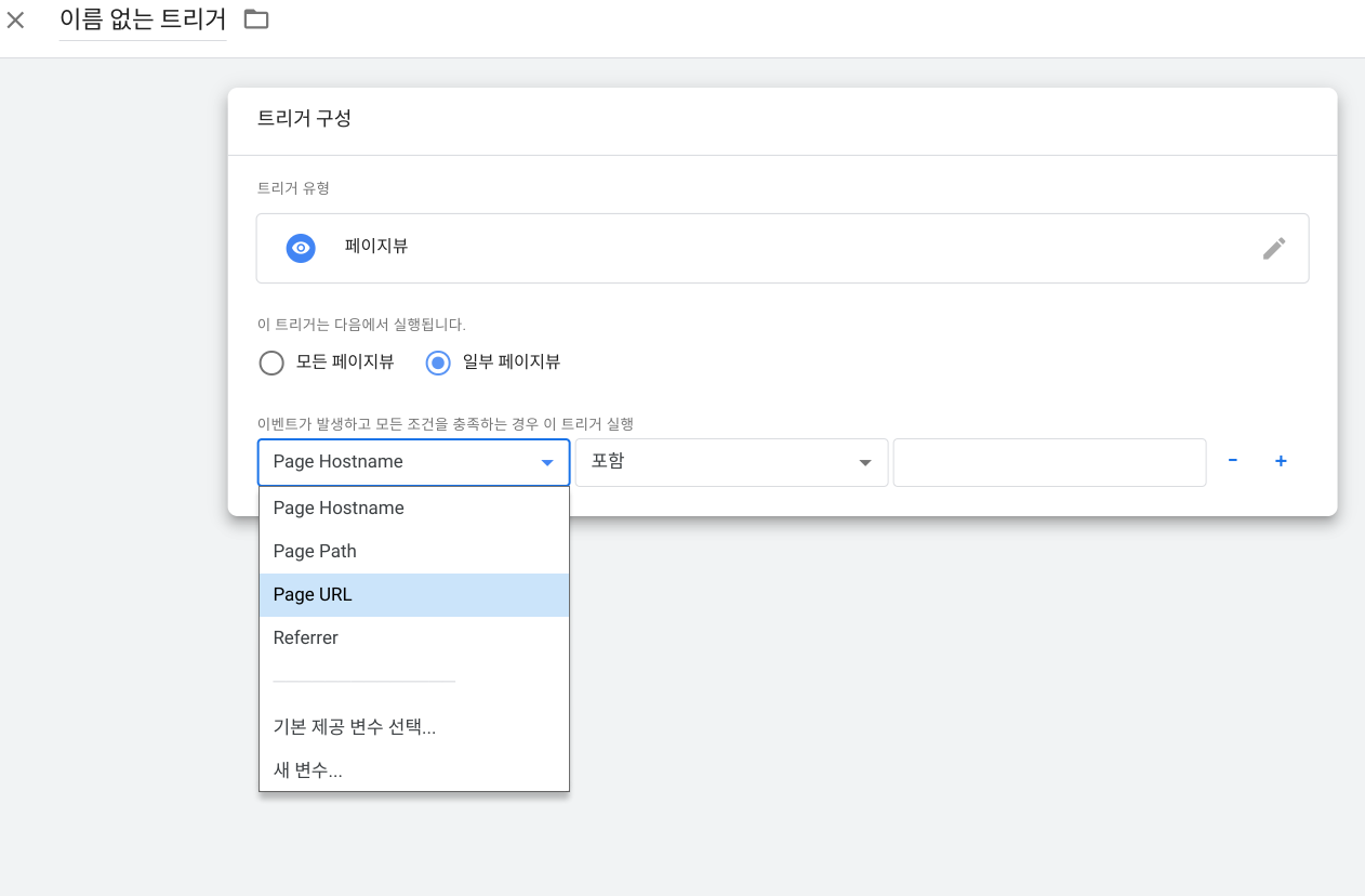 '일부 페이지 뷰' 선택 후 박스 하단에 첫 번째 칸 선택하여 'Page URL' 선택