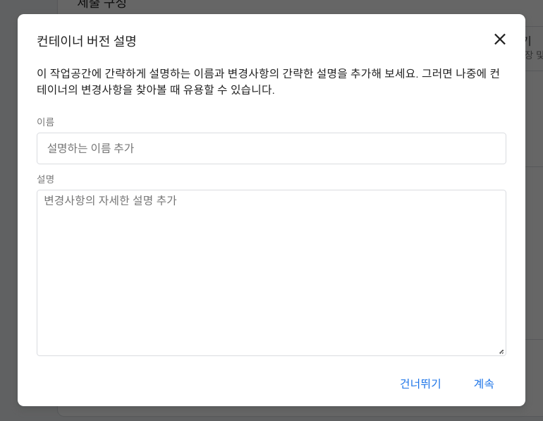 마지막으로 '건너뛰기' 또는 '계속' 선택합니다(이름과 설명은 생략가능하나 작성한 경우 '계속' 선택).