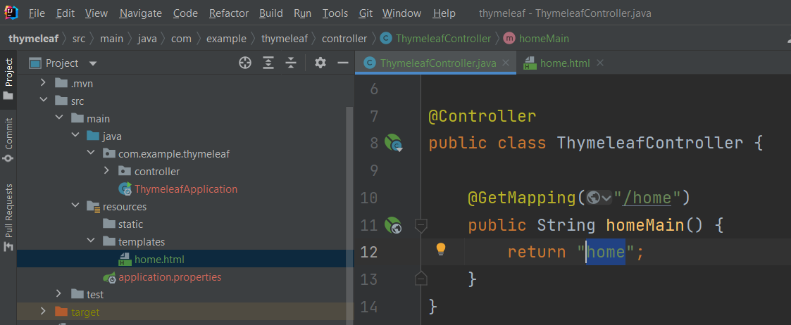컨트롤러 패키지를 만들고 아래와 같이 컨트롤러를 생성하고 엔드포인트를 만듭니다. 엔드포인트 메서드에서 반환되는 값은 템플릿 파일의 이름이 됩니다.